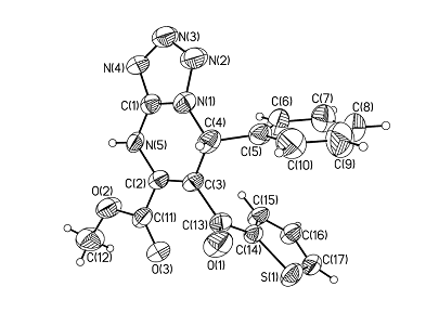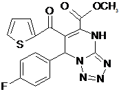 Для установления пространственной структуры соединений (I а-м) в кристаллическом состоянии был получен кристалл метилового эфира 7-фенил-6-(2-тиеноил)-4,7-дигидротетразоло[1,5-а]пиримидин-5-карбоновой кислоты медленной кристаллизацией из этилового спирта и проведены его рентгеноструктурные исследования. Полученные результаты свидетельствуют о полном соответствии предложенной структуры соединения данным РСА (рис.1).