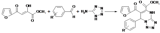 Выдерживание при 130-140º С в течение 20 – 30 мин. метилового эфира 2-фураноилпировиноградной кислоты со смесью 5-аминотетразола и ароматического альдегида приводит к образованию метил 7-арил(гетерил)-6-(2-фураноил)-4,7-дигидротетразоло[1,5-а]пиримидин-5-карбоксилатов (IIа-я).