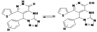 Научная новизна работы. Осуществлен синтез метил 7-арил(гетерил)-6-(2-тиеноил)-4,7-дигидротетразоло[1,5-а]пиримидин-5-карбоксилатов, метил 7-арил(гетерил)-6-(2-фураноил)-4,7-дигидротетразоло[1,5-а]пиримидин-5-карбоксилатов. Обнаружено, что при взаимодействии полученных соединений с гидразингидратом образуются 5-оксо-8-тиенил-9-арил(гетерил)-4,9-дигидротетразоло[1',5':1,2] пиримидино[4,5-d]пиридазин-5-оны и 5-оксо-8-фурил-9-арил(гетерил)-4,9-дигидротетразоло[1',5':1,2]пиримидино[4,5-d]пиридазин-5-оны.