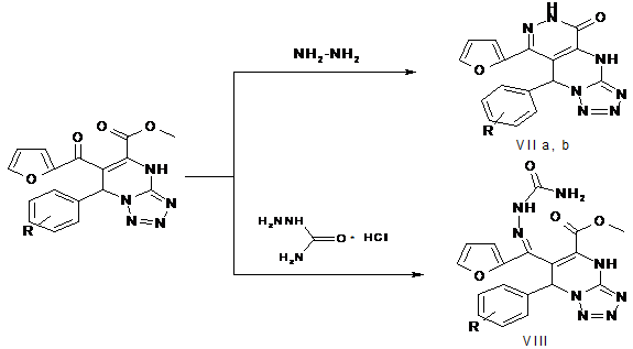 Было установлено, что при выдерживании метил 7-арил(гетерил)-6-(2-фураноил)-4,7-дигидротетразоло[1,5-a]пиримидин-5-карбоксилатов с гидразингидратом при С до прекращения газовыделения образуются 5-оксо-8-(2-фурил)-9-фенил-4,9-дигидротетразоло[1',5':1,2] пиримидино[4,5-d]пиридазин-5-оны (VII а, б).