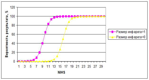 По итогам статистического анализа можно сделать вывод, что возраст и клинико-томографический вариант развития ГТ не оказывают влияния на ранний исход при возникновении вторичной геморрагии. Основными прогностически неблагоприятными факторами являются обширный размер области ишемического повреждения и тяжесть неврологического дефицита в дебюте инсульта. Причем обширность ишемии существенно влияет на вероятность возникновения неудовлетворительного исхода при значениях NIHSS, находящихся в интервале от 5 до 18 единиц. Если значение Шкалы NIHSS меньше 5, то независимо от размера инфаркта наблюдается вероятность результата «0» (т. е положительный исход в любом случае), а если значение NIHSS больше 19, то вероятность развития неудовлетворительного исхода близка к 100% при всех размерах инфарктной зоны.