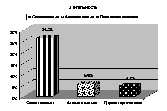 Отдельно стоит упомянуть летальность среди обследованного контингента. Она была достоверно выше среди больных, имевших симптомный характер геморрагии, чем у больных с асимптомными ГТ, и пациентами группы сравнения (рис. 2).