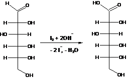 В химии углеводов для селективного окисления альдегидных групп применяется щелочной раствор иода. Так из D-глюкозы образуется D-глюконовая кислота: