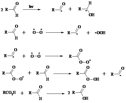 Альдегиды медленно окисляются кислородом воздуха при комнатной температуре до карбоновых кислот (аутоокисление альдегидов).