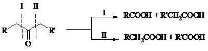 Кетоны, как правило, устойчивы к окислению в нейтральной среде и подвергаются расщеплению только в кислой и щелочной средах: щелочным раствором KMnO4, горячей HNO3, соединениями Cr(VI) в серной кислоте. В связи с этим считают, что окислению кетона предшествует его енолизация; образовавшийся енол подобно другим алкенам окисляется по кратной связи с расщеплением углеродного скелета. Поскольку несимметричные кетоны могут енолизоваться в обоих возможных направлениях, их окислительное расщепление также осуществляется по двум направлениям.