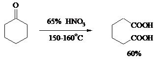 Промышленное значение имеет окисление циклогексанона, поскольку он легко доступен и при расщеплении дает только одну адипиновую кислоту. Реакцию проводят при повышенной температуре, применяя в качестве окислителя конц. HNO3, CrO3+H2SO4, щелочной раствор KMnO4: