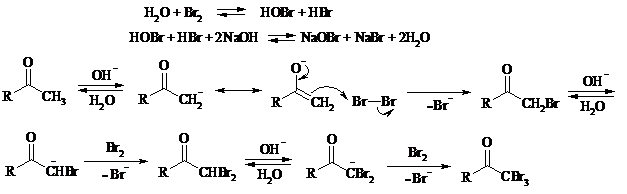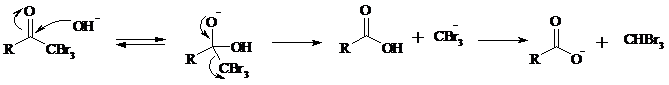 Далее под действием щелочи тригалогенметилкетон расщепляется по следующей схеме: