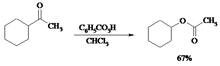 Под действием перкислот, а также кислоты Каро H2SO5 и H2S2O8 кетоны окисляются в сложные эфиры (реакция Байера-Виллигера). Реакция обычно проводится при комнатной температуре в полярных органических растворителях, устойчивых к действию надкислот (хлороформ, уксусная кислота, уксусный ангидрид):