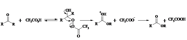 В начале под действием надкислоты, если она достаточно сильная, или каталитических количеств серной кислоты происходит протонизация карбонильного атома кислорода кетона. При этом карбонильный атом углерода приобретает избыточный положительный заряд. Затем к нему нуклеофильно присоединяется анион надкислоты. Последующий гетеролитический разрыв связи кислород-кислород, миграция одного из радикалов в виде аниона к положительно заряженному атому кислорода и отрыв протона приводят к образованию сложного эфира: