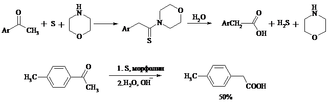В результате карбонильная группа кетона восстанавливается до метиленовой, а метильная окисляется до карбоксильной. Фактически сначала получают тиоамид (или амид) кислоты, который затем омыляют. С ростом числа атомов углерода в цепи (n) выходы карбоновых кислот падают.