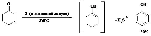 При обработке циклогексанонов серой или селеном протекает дегидрирование и образуются фенолы. По-видимому, реакция протекает через стадию предварительной енолизации исходных кетонов:
