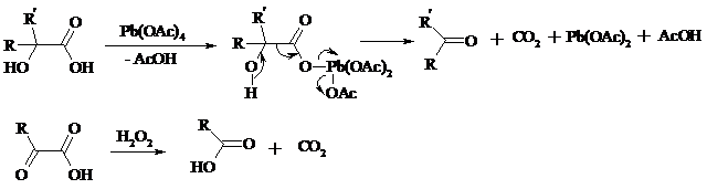 a-Гидрокси - и a-кетокислоты не расщепляются под действием HIO4, но эта реакция идет с тетраацетатом свинца, H2O2 в щелочной среде и другими реагентами. Такие реакции представляют собой окислительное декарбоксилирование. Из a-гидроксикислот получаются альдегиды или кетоны, а из a-кетокислот – карбоновые кислоты: