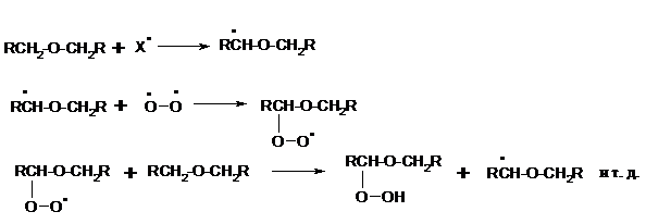 Простые эфиры проявляют повышенную склонность к аутоокислению в присутствии кислорода с образованием гидропероксидов. Процесс протекает по цепному радикальному механизму. Эффективным катализатором аутоокисления может служить любой источник свободных радикалов. Аутоокисление простых эфиров представляет большую потенциальную опасность при работе с эфирами в качестве растворителей, поскольку гидропероксиды, накапливающиеся в остатке при перегонке, могут детонировать при слабом перегреве.