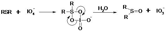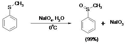 Под действием метапериодата натрия NaIO4, м-хлорнадбензойной кислоты, трет-бутилгипохлорита сульфиды окисляются в сульфоксиды. Наиболее часто применяется 0.5 М водный раствор NaIO4. Этот реагент селективно окисляет сульфиды до сульфоксидов практически без примеси сульфонов, если окисление проводить при 0°С в бинарной системе вода – органический растворитель (метанол, диоксан, ацетонитрил):