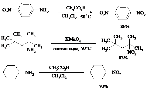 Первичные амины, в которых аминогруппа соединена с третичным атомом углерода, с высоким выходом окисляются в нитросоединения перманганатом калия. Первичные амины, содержащие первичные, вторичные или третичные алкильные радикалы окисляются до нитросоединений сухим озоном, а также различными перкислотами.
