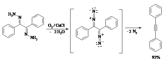 Окисление дигидразонов 1,2-дикарбонильных соединений является одним из лучших современных методов синтеза замещенных ацетиленов. В качестве окислителей используют HgO, Pb(OAc)4, O2 в присутствии СuCl и др.: