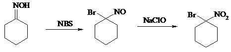 При действии N-бромсукцинимида на оксимы образуются геминальные бромнитрозосоединения (реакция Иффланда), которые далее могут быть окислены в бромнитросоединения под действием водного раствора гипохлорита, озона, HNO3 и др.: