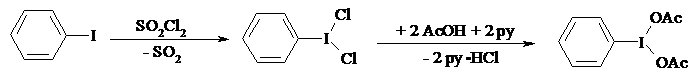 При перемешивании растворяют 27.5 г (0.1 моль) фенилиодозохлорида в 65 мл пиридина, и раствор охлаждают до 0-5°С. Сохраняя эту температуру, постепенно из капельной воронки приливают 125 мл уксусной кислоты, потом 200 мл воды. Реакционную смесь перемешивают при 5-10ºС еще полчаса, затем фильтруют образовавшийся фенилиодозодиацетат, на фильтре промывают петролейным эфиром. Выход 24 г (75%). Продукт переосаждают из хлороформа петролейным эфиром, т. пл. 157-158°С.