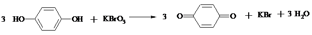 В плоскодонной колбе емкостью 100 мл растворяют 5 г (45.5 ммоль) гидрохинона в 50 мл воды, нагретой до 50ºС. Раствор охлаждают до 20°С и медленно при перемешивании по каплям прибавляют 2.5 мл 5%-ного раствора серной кислоты (катализатор). Затем в реакционную смесь вносят осторожно 2.75 г (16.5 ммоль) бромата калия, помещают термометр и нагревают на водяной бане до 60ºС. Начинается реакция окисления с образованием в качестве промежуточного продукта зеленовато-черного осадка хингидрона. Смесь выдерживают при 60ºС в течение 20 мин. Реакция окисления считается законченной, как только черный цвет реакционной массы изменится до ярко-желтого цвета n-бензохинона. В случае, если цвет не изменится полностью, следует добавить еще около 0.25 г бромата калия. Реакционную массу нагревают до полного растворения бензохинона (80ºС), затем охлаждают до 0ºС. Выпавший n-бензохинон отфильтровывают на воронке Бюхнера, промывают на фильтре небольшим количеством холодной воды и сушат на воздухе между листами фильтровальной бумаги.