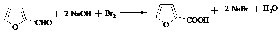 В трехгорлой колбе с мешалкой и термометром растворяют 15 г (0.375 моль) твердого гидроксида натрия в 50 мл воды. Охлаждают раствор до 0ºС смесью льда и соли и добавляют по каплям при перемешивании 5.6 мл (17.4 г, 0.109 моль) брома (температура реакционной смеси не должна превышать +5ºС). К полученному раствору гипобромита в течение 1 ч добавляют по каплям 9.6 г (8.3 мл, 0.1 моль) свежеперегнанного фурфурола, поддерживая температуру ниже +5ºС. Продолжают перемешивание 2 ч при той же температуре и осторожно подкисляют реакционную массу предварительно охлажденной до 0ºС концентрированной соляной кислотой до кислой реакции среды. Отфильтровывают выпавший осадок, промывают его холодной подкисленной HCl водой и высушивают сначала на воздухе, а затем в вакуум-эксикаторе над прокаленным хлористым кальцием.