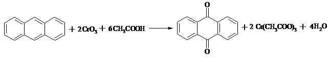В круглодонной колбе, снабженной двурогим форштосом с обратным холодильником и капельной воронкой, растворяют при кипячении 1.25 г (7 ммоль) тонко растертого антрацена в 55 мл ледяной уксусной кислоты. В течение 1 ч при постоянном кипячении прибавляют из капельной воронки раствор 5 г (50 ммоль) хромового ангидрида в 5 мл воды и 20 мл ледяной уксусной кислоты. После охлаждения реакционную смесь разбавляют 140 мл воды. Через 1 ч отфильтровывают выпавший антрахинон, промывают его водой, разбавленным раствором соды, снова водой и сушат на воздухе. Полученный сырой антрахинон перекристаллизовывают из ледяной уксусной кислоты.