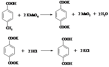 В круглодонной колбе, снабженной двурогим форштосом с капельной воронкой и обратным холодильником, растворяют 1 г (7.4 ммоль) n-толуиловой кислоты в разбавленном растворе гидроксида калия и при кипячении постепенно прибавляют из капельной воронки раствор 2.4 г (15.2 ммоль) KMnO4 в 50 мл воды. Смесь кипятят 3 ч.