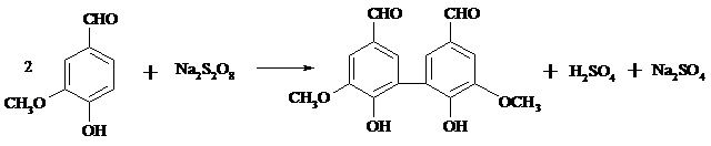 В круглодонной колбе на 500 мл, снабженной механической мешалкой, растворяют при нагревании 3 г (19.7 ммоль) ванилина в 200 мл воды, раствор охлаждают до комнатной температуры и при энергичном перемешивании прибавляют сначала 0.1 г FeSO4·7H2O, потом 2.5 г (10.5 ммоль) Na2S2O8. Через 30 мин выпавший осадок отфильтровывают и еще влажным растворяют в 20 мл 5%-ного раствора гидроксида натрия. Из полученного раствора (при необходимости фильтруют) подкислением соляной кислотой высаживают дегидродиванилин.
