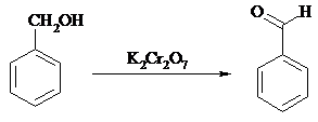 В трехгорлую колбу, снабженную обратным холодильником, капельной воронкой и термометром, помещают 10.8 г (0.1 моль) бензилового спирта, 100 мл бензола (либо толуола) и 20 мл воды. При перемешивании в течение 30 мин при 70-75ºС прибавляют раствор 29.4 г (0.1 моль) дихромата калия в 100 мл воды. Смесь перемешивают при 70-75ºС еще в течение 8 ч. Органическую фазу отделяют, водную экстрагируют бензолом (3 раза по 20 мл). Бензольные растворы объединяют, промывают последовательно водой, насыщенным раствором гидрокарбоната натрия, снова водой и экстракт сушат сульфатом магния. Смесь разгоняют с дефлегматором, фракция с т. кип. 176-180ºС представляет собой бензальдегид, выход 9.1 г (86%).