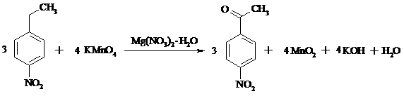 В круглодонную трехгорлую колбу емкостью 500 мл, снабженную мешалкой, термометром и обратным холодильником, помещают раствор 50 г (0.194 моль) гексагидрата нитрата магния в 200 мл воды и 15.1 г (0.1 моль) n-нитроэтилбензола. Смесь подогревают до температуры 60ºС и, при энергичном перемешивании, небольшими порциями добавляют к ней 25 г (0.16 моль) хорошо измельченного перманганата калия, прибавляя каждую следующую порцию только после обесцвечивания раствора. По окончании добавления перманганата смесь перемешивают при температуре 60ºС еще в течение 2 ч, затем повышают температуру до 90ºС и быстро фильтруют горячей через воронку Бюхнера. Осадок диоксида марганца тщательно промывают небольшим количеством кипящей воды. Из фильтрата выделяется масло, которое при охлаждении затвердевает. Выделившиеся кристаллы отфильтровывают и сушат на воздухе. Выход ~ 7 г (42%).