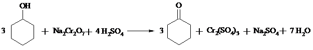 В трехголую колбу вместимостью 500 мл, снабженную мешалкой, капельной воронкой и термометром, помещают 12.5 г (0.125 моль, 13.3 мл) циклогексанола и 15 мл диэтилового эфира. Содержимое колбы охлаждают до 0-5ºС в бане со льдом. Отдельно в стеклянном стакане растворяют 11.5 г (0.039 моль) дихромата натрия (в виде дигидрата) в 125 мл воды. К полученному раствору осторожно приливают 10 мл (18.4 г, 0.188 моль) концентрированной серной кислоты. Окислительную смесь охлаждают до 4ºС, переносят в капельную воронку и постепенно при перемешивании прибавляют к раствору циклогексанола. Температуру реакционной смеси поддерживают в интервале 3-5ºС. После прибавления всего количества окислителя перемешивание продолжают в течение 3 ч при комнатной температуре. Затем смесь переносят в делительную воронку и экстрагируют диэтиловым эфиром 2 раза по 25 мл. Эфирные вытяжки объединяют, встряхивают с небольшим количеством безводного карбоната калия, фильтруют через слой карбоната калия и сушат сульфатом натрия.
