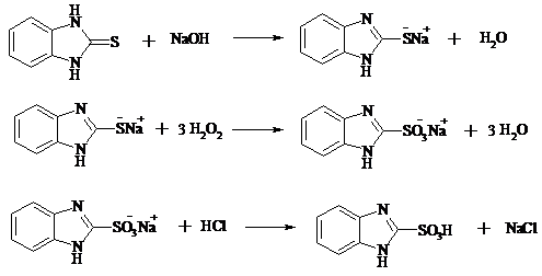 В трехгорлой колбе, снабженной мешалкой, термометром и капельной воронкой (Не допускать герметичности прибора!), растворяют 7.5 г (0.05 моль) 2-меркаптобензимидазола в растворе 4 г (0.1 моль) NaOH в 200 мл воды. Полученный раствор охлаждают до 20ºС и прибавляют к нему по каплям при энергичном перемешивании и охлаждении ледяной водой 30 мл 30%-ного раствора H2O2 с такой скоростью, чтобы температура реакционной массы не поднималась выше 37-40ºС. Первые 10-15 мл пероксида водорода необходимо добавлять особенно осторожно, так как вследствие сильного разогревания возможен выброс реакционной массы. По окончании прибавления H2O2 смесь перемешивают при комнатной температуре еще 4 ч, а затем оставляют на ночь. Далее раствор при необходимости фильтруют и подкисляют конц. HCl до pH 1-2. Белоснежный осадок бензимидазол-2-сульфокислоты отфильтровывают из охлажденного раствора, тщательно промывают ледяной водой, ацетоном и высушивают при 100-120ºС.
