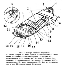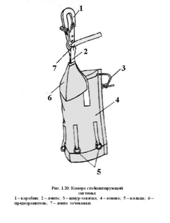 Форма цилиндрическая. Материал – капроновый авизент. Состоит из основы (4) и имеющихся на ней: в верхней части – карабин (1) для крепления к тросу или удлинителю в самолете, ленту зачековки (7) для зачековки резиновой соты, предохрани, шнур-завязку (3) для стягивания камеры; в нижней – металлические кольца (5) для контровки с кольцами стабилизатора.