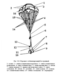 овлено из капроновой ткани серого цвета и имеет форму равнобедренного треугольника. Перья сострочены по высоте, образуя четыре пера стабилизатора. По боковым сторонам каждого пера нашиты ленты ЛТКкрП-26-600, образующие в верхней части петли, к которым привязаны стропы, а в нижней части переходящие в парашютное звено. На каждую боковую сторону пера нашито по ленте с кольцом (17). Кольца служат для их контровки с кольцами, нашитыми на камере стабилизирующего парашюта.