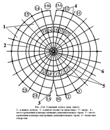 Основа купола (1) имеет форму усеченного конуса с площадью большего основания 1,5 м2, изготовлена из капрона. На купола в полюсной части нашито вытяжное устройство (2), которое предназначено для обеспечения наполняемости купола и состоит из восьми карманов. На внешнюю сторону купола настрочены усилительные ленты: радиальные (3) – из ленты ЛТКП-15-185 и круговые (4) из ленты ЛТКП-13-70. Кромка купола усилена подгибом ткани на внешнюю сторону и настроченной на нее с двух сторон лентой ЛТКП-15-185. По нижней кромке купола под радиальные усилительные ленты продеты и пристрочены зигзагообразной строчкой концы 16 строп, изготовленных из шнура ШКП-200. Длина крайних строп (6) в свободном состоянии от нижней кромки купола до пера стабилизатора – 0,52 м, а средних (5) строп – 0,5 м. На куполе нанесено заводское клеймо (18): индекс парашюта и год изготовления.