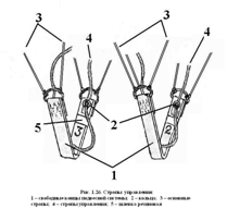 Свободные концы замаркированы цифрами: 1 и 2 – правая пара, 3 и 4 – левая и заканчиваются пряжками-полукольцами, к которым крепятся стропы основного парашюта. На свободных концах, замаркированных цифрами 2 и 3, имеются резиновые шлевки из эластичной ленты, предназначенные для заправки слабины строп управления. В верхней части свободных концов нашиты четыре ленты с кольцами, через которые пропущены стропы управления.