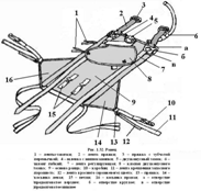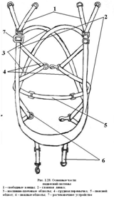 Главная лямка сострочена из лент в два сложения. Слева в верхней части главной лямки расположены две изогнутые пряжки: нижняя для соединения его с левым наспинно-плечевым обхватом, верхняя – для крепления левой пары свободных концов.