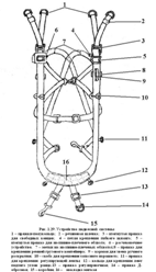 Грудная перемычка образована наспинно-плечевыми обхватами, идущими вверх от крестовины через изогнутые пряжки, и имеет в левой половине карабин, а в правой – пряжку.