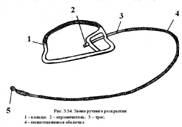 Предназначено для раскрытия двухконусного замка самим па-рашютистом. Оно состоит из кольца, изготовленного из сталь-ного прутка; троса длиной 0,6 м; ограничителя и проволочной петли. Трос звена ручного раскрытия на расстоянии 0,21 м от ограничителя и 0,057 м от петли покрыт полиэтиленовой оболочкой. Допускается звено ручного раскрытия без полиэтиленовой оболочки на тросе.
