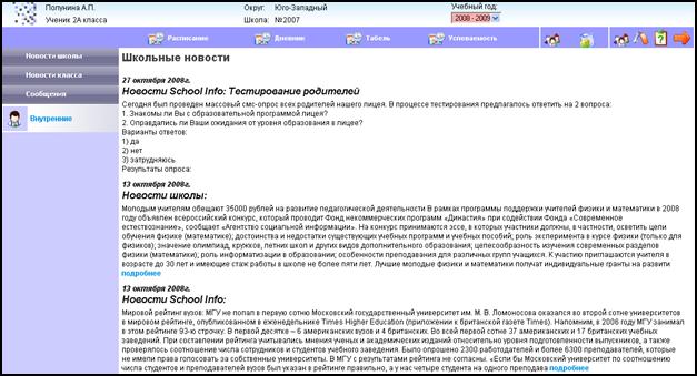 - Страница пользователя Системы – стартовая страница, которая отображается сразу после авторизации пользователя в Системе. В рабочем пространстве данной страницы отображаются новости школы/класса.