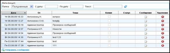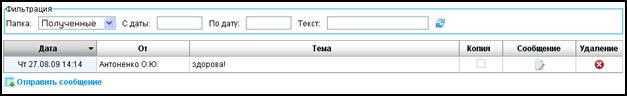 Если в поле «Папка», расположенном над таблицей внутренних сообщений выбрать из списка значение «Отправленные», то будет установлен фильтр по отправленным сообщениям. После установки данного фильтра в рабочем пространстве страницы отобразится аналогичная таблица, как и в случае с фильтрацией по полученным сообщениям (рисунок 17), но с той разницей, что в данной таблице появится столбец «Статус». В этом столбце отображается информация о состоянии отправленного сообщения (доставлено, не доставлено, ошибка при доставке и проч.).