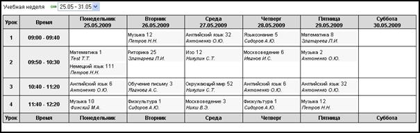 В Системе предусмотрен просмотр расписания на учебную неделю (фактического расписания). Фактическое расписание создается с учетом внесения различного рода изменений в плановое расписание (единое расписание на учебный период) в рамках учебной недели. К таковым изменения могут быть отнесены: изменение времени проведения уроков, замена учителей и проч.