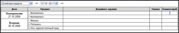 Как видно из рисунка 24, строки таблицы содержат наименования предметов, а столбцы – содержание домашнего задания на определенную дату, оценки по предметам и др.