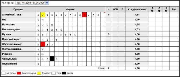 Внизу, под табелем оценок располагается легенда с типами оценок. Каждый тип оценки имеет свой цвет (таблица 3)