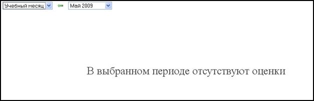 Данная информация будет отображена в том случае, если для данного ученика в выбранном учебном периоде проставлены оценки в «Табеле». Иначе, после выбора из списка поля «Класс» нужного учебного периода, в рабочем пространстве страницы появится сообщение о том, что для выбранного периода отсутствуют оценки. На рисунке 28 изображена ситуация, отражающая факт отсутствия у ученика оценок в мае месяце 2009 года.