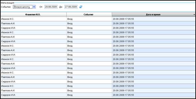 Для удобства поиска учащихся при просмотре данных о посещении имеются фильтры по событию (вход в школу, выход из школы), по временному интервалу (поля «От» и «До»). Чтобы отфильтровать список учеников, например, по событию «Вход в школу», выберите из списка поля «Событие» нужное значение события. В результате данные таблицы будут автоматически отфильтрованы. Ссылка