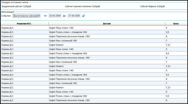 Для удобства поиска учащихся при просмотре данных о питании имеются фильтры по событию (выполнение заказа, пополнение счета), по временному интервалу.