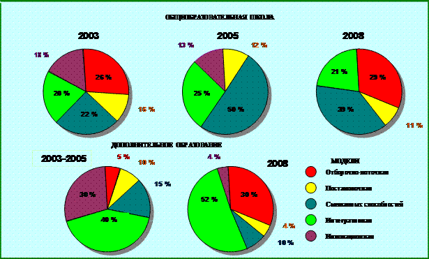 Однако, результаты мониторинга, полученные в 2008 году, показали, что достигнутые ранее позитивные тенденции развития школы закрепить не удалось. Особенно это проявилось в состоянии образовательной модели основной школы, в которой вновь стали доминировать черты отборочно-поточной и постановочной моделей (в сумме 40 %), причём, совершенно исчезли признаки инновационной модели, которые даже в 2003 году составляли 18 %.