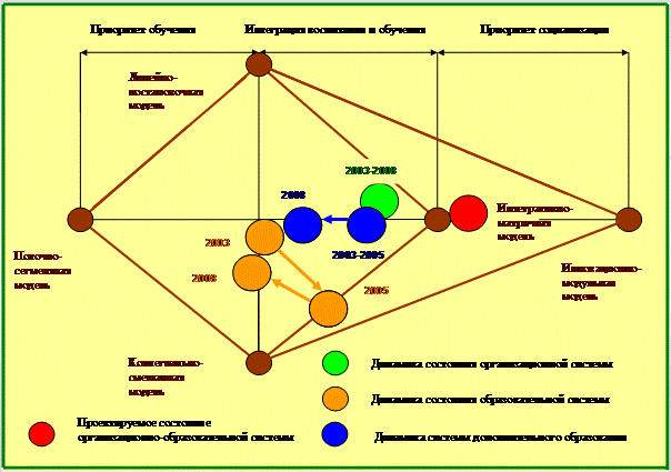 реорганизация подсистемы основного образования, которая заключается в повышении эффективности взаимодействия между педагогами общего и дополнительного музыкального образования; активное привлечение учителей (повышение их мотивации, заинтересованности и т. д.) в методические объединения, в разработку и реализацию воспитательного компонента образования, включающего в себя не только направленность на достижение высоких учебных результатов, но и, преимущественно, на развитие личности школьников, их социализацию; серьезный пересмотр методов преподавания, поскольку встает вопрос о необходимости более глубокого учета творческих наклонностей учащихся и их особого мировосприятия и миропонимания; максимальная согласованность преподавания различных предметов для лучшей интеграции полученных знаний в единую картину мира школьников; создание условий для возможности «проживания» учащимися полученных знаний через их эмоциональную, эстетическую, нормативную сферы.Следует отметить, что позиция в модельном поле общеобразовательной подсистемы данной школы, а также проектируемые позиции её организационной и образовательной подсистем, в целом, совпадают с выявленным нами характером позиционирования и других школ, а также с данными по ряду российских школ, приводимыми , который констатирует, что картина «с точки зрения соответствия целей, организации образовательного процесса и управления, была весьма противоречива» (1998, с. 42). Согласованность организационной модели данной школы и образовательной модели её кафедры дополнительного образования, а также приближенность этих подсистем к проектируемому состоянию (интегративно-матричной модели с элементами инновационно-модульной) объясняется тем, что директором школы была защищена диссертация по проектированию организационной структуры для школы с углубленным изучением предметов эстетического цикла, т. е., по существу, для своей «музыкальной кафедры».