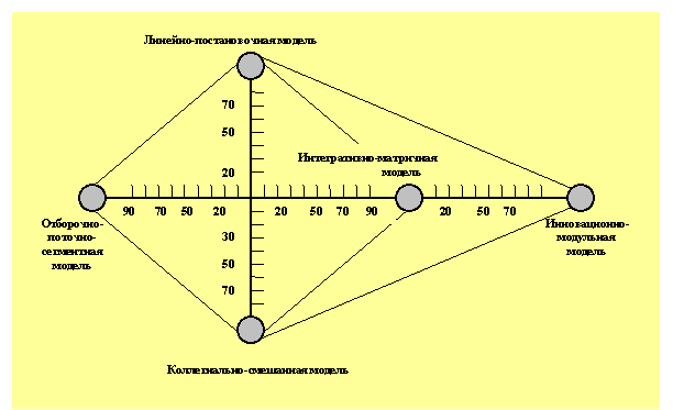 Опыт практического использования методики моделирования школьных организационно-образовательных систем (Л. де Калуве, Э. Маркс, М. Петри, 1993) показал необходимость её модернизации. Во-первых, нами был изменен ряд формулировок в диагностических таблицах с целью их адаптации к реалиям российской школы и, во-вторых, в модельное «поле структурного развития» была введена количественная шкала, что позволило математически точно позиционировать в этом поле модели школьных образовательных и организационных подсистем (См. Рис. 1).