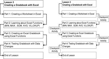 В Moodle, модуль «Лекции» был использован для предоставления содержания курса. Урок в Moodle это серия интерактивных страниц, который требует от участника курса прохождения некоторого теста перед тем, как появлялась следующая страница. Другими словами, каждая страница обычно оканчивалась вопросом и некоторым числом возможных ответов. В зависимости от выбранного ответа участник курса либо попадал на следующую страницу, либо был возвращен назад на предыдущую страницу. В ходе эксперимента, учитывались только возможности для попадания на следующую страницу. Оценки, полученные при просмотре лекций в Moodle? не добавлялись к оценке за курс, потому что данная функция не была доступна в BlackBoard, и, следовательно, сравнение систем по данному параметру представлялось невозможным (см. Рисунок 3).